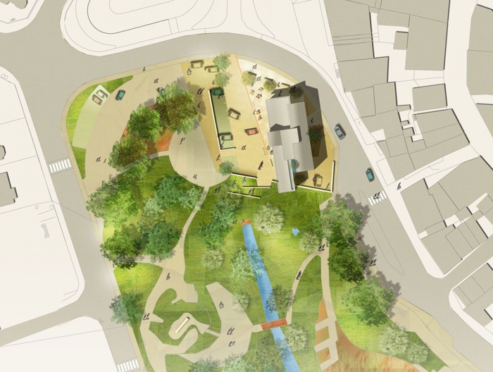Sur un très beau site plongeant vers un bassin d'eau, le fort de bitche comme tableau de fond, le projet cherche à s'insérer dans le site en en reprenant les codes, tout en proposant un batiment généreux, lumineux et dont la spatialité intérieure répond à tous les attendus de fonctionnalité du programme